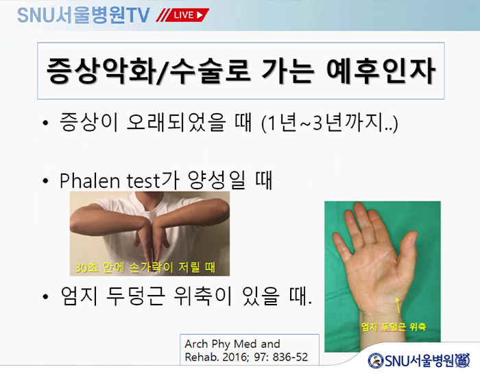 따라서 증상이 오래됐거나, Phalen test가 양성일 때(test를 시행하고 30초 안에 손가락이 저릴 때),