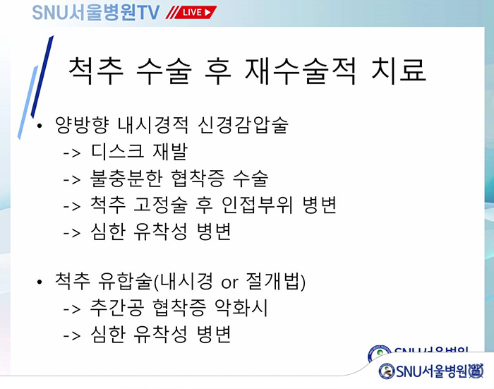 오늘은 척추 수술 후 통증 재발에 대한 내용을 자세히 설명해주셨습니다.